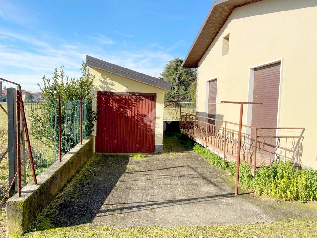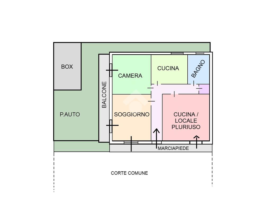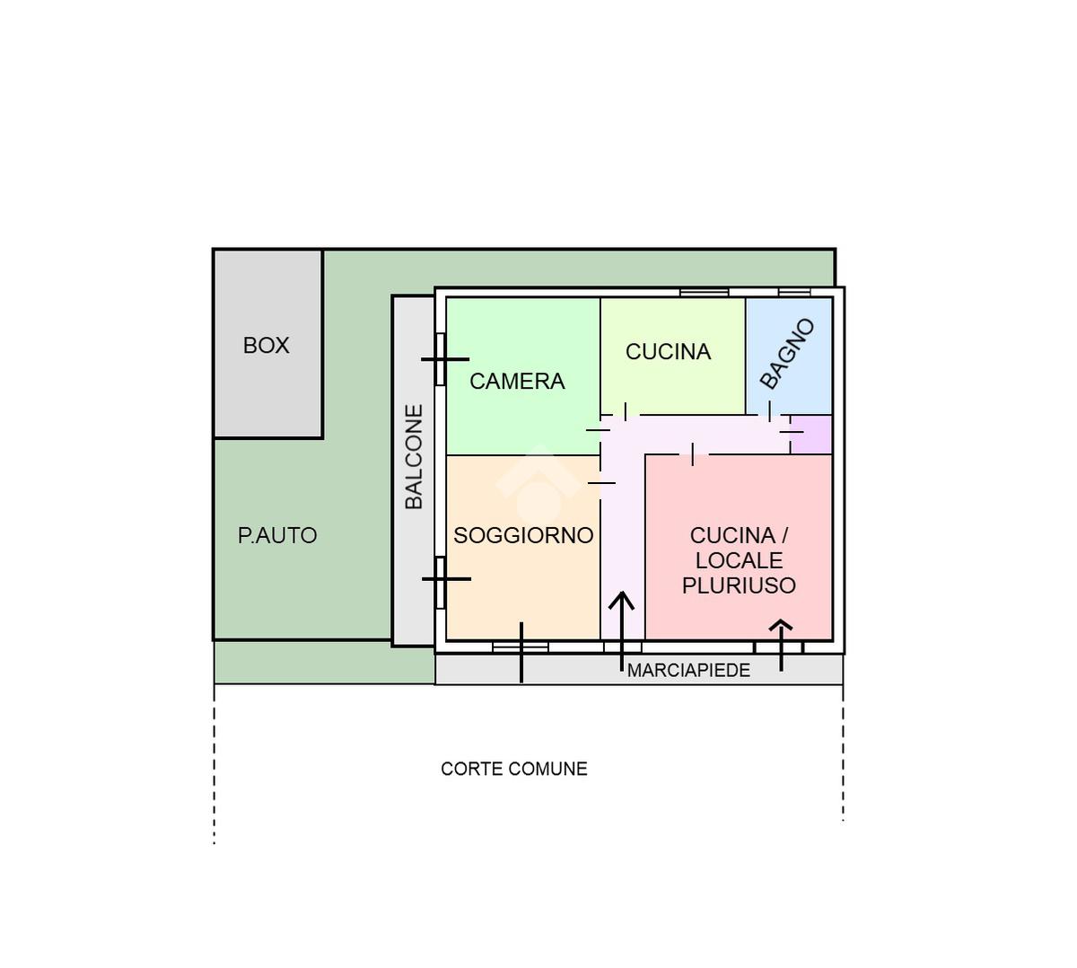 In centro paese in corte riservata, casetta semi-indipendente su unico livello, comoda e funzionale, di tre locali di 95 mq. circa, composta da un ingresso con disimpegno, un soggiorno con balcone, una cucina abitabile, una camera matrimoniale con balcone, un bagno completo con doccia, ed un ripostiglio dove è collocata la caldaia per il riscaldamento, oltre ad un locale utilizzabile come studio / seconda camera / sala pranzo in funzione delle necessità personali, dotato di un ingresso diretto.