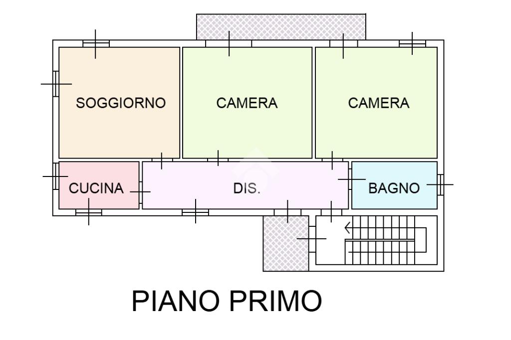 L’abitazione al piano primo, con vano scala d’accesso indipendente, è composta da un ampio disimpegno servito da un balconcino, un comodo soggiorno con un cucinotto, attualmente separato ma con parete attigua che potrebbe essere demolita per rendere un ambiente open-space, una camera matrimoniale ed una camera doppia serviti da una ulteriore balcone ed un bagno completo con vasca.