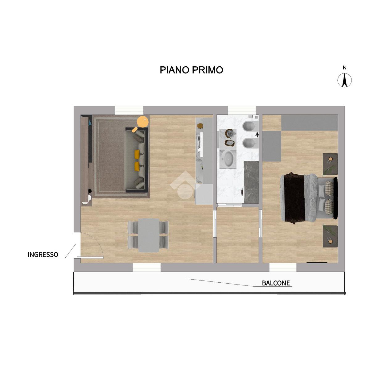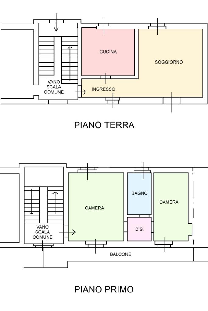 Al piano primo di 52 mq. circa, sono presenti due locali, un balcone con fronte a Sud, e un bagno con vasca, con accesso dalla scala interna comune.
