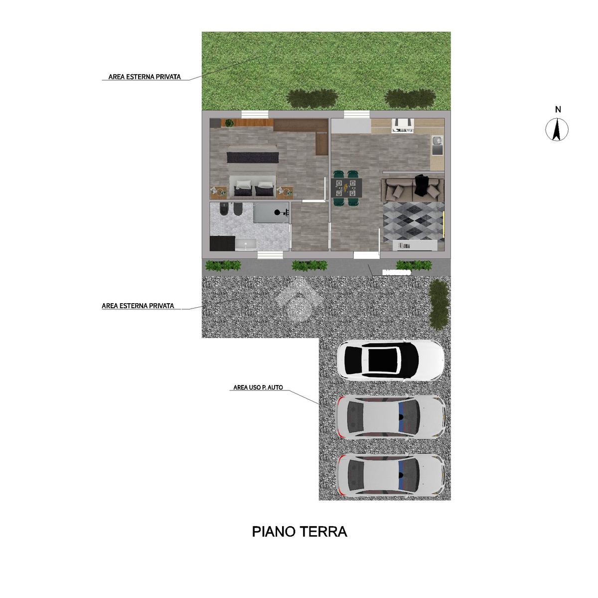 Inoltre, di proprietà sono presenti due aree di ciascuna di 27 mq. (9x3 mt.), collocate davanti e sul retro del fabbricato ed un ulteriore area di 31 mq. (5x6.2 mt.) sempre di proprietà adatta ad uso di tre (3) posti auto all’interno del cortile.