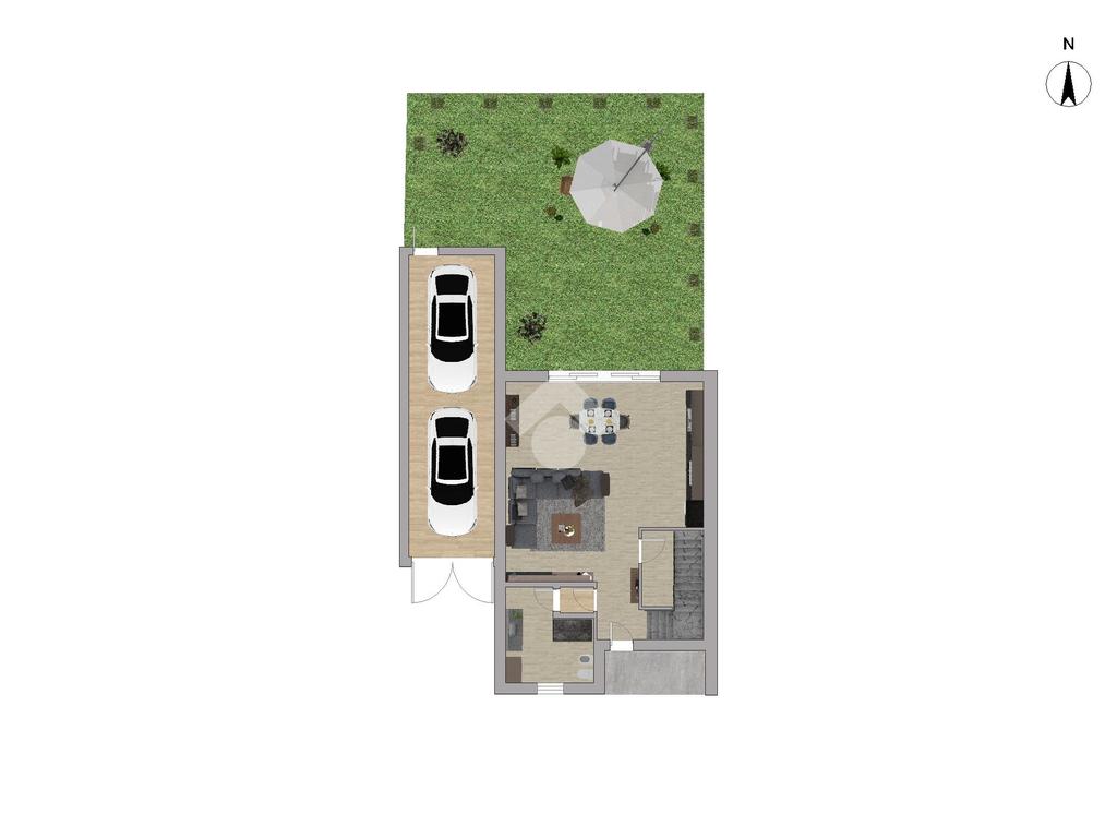 Il piano terra di 75 comprende un comodo porticato d'ingresso all'abitazione dotata di un disimpegno, un comodo soggiorno con un'ampia portafinestra che conduce al giardino privato sul retro, una parte attrezzata ad angolo cottura, oltre a un bagno completo. Nel vano scala che conduce al primo piano è ricavato un comodo ripostiglio nel sottoscala.