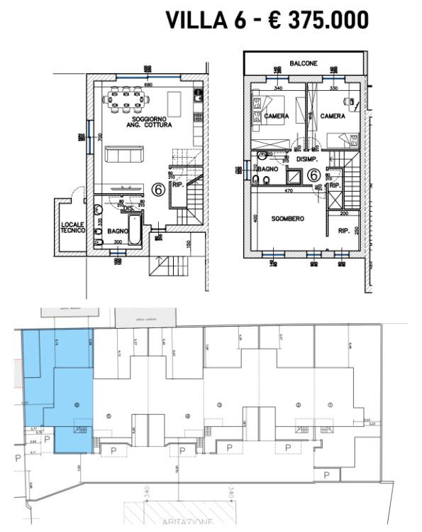 Le ville in costruzione hanno ingressi completamente indipendenti tra loro, uno pedonale con porticato d'accesso all'abitazione ed uno carraio per l'accesso al box doppio in lunghezza con antistante un posto auto. Le ville hanno la zona giorno al piano terra e la zona notte al piano primo, presentano una doppia esposizione Est-Ovest soleggiata, che rende i locali abitativi luminosi e ben arieggiati. Il giardino privato si trova nel retro dell'abitazione in posizione nascosta, e sono collocate in zona residenziale riservata e tranquilla.