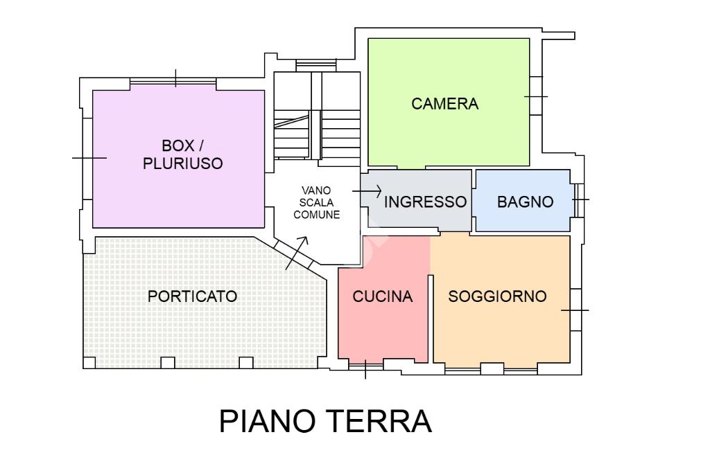 La piano terra dal porticato di 25 mq circa, esposto a Sud verso il giardino utile anche da utilizzare per piacevoli momenti di relax della famiglia e con amici, si accede all’interno dell’abitazione dove è presente il vano scala che collega i piani e dà accesso sia ad un locale ripostiglio di 27 mq. circa eventualmente utilizzabile come autorimessa e sia al bilocale di 70 mq. composto da soggiorno con cucinotto e camera da letto, con porte finestra sul giardino, oltre a un bagno completo con doccia e vasca da bagno.